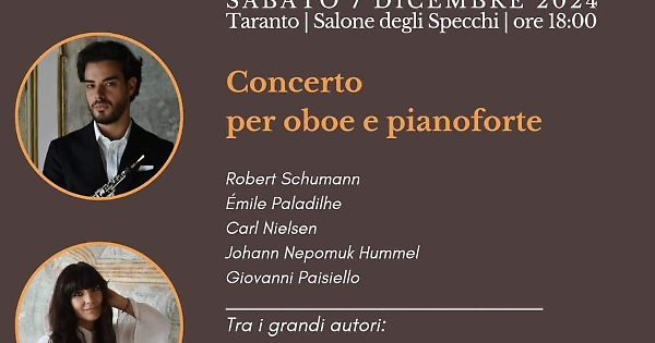 Concerto per oboe e pianoforte sabato, 7 dicembre, nel Salone degli Specchi di Taranto: “Dono di Natale: Schumann e altri echi” il titolo dello spettacolo che vuole celebrare la magia delle feste attraverso le note dei grandi compositori, con un’attenzione particolare alla tradizione musicale tarantina. Protagonisti dell’evento l’oboista, Francesco Nigro e la pianista, Violetta Petrelli.