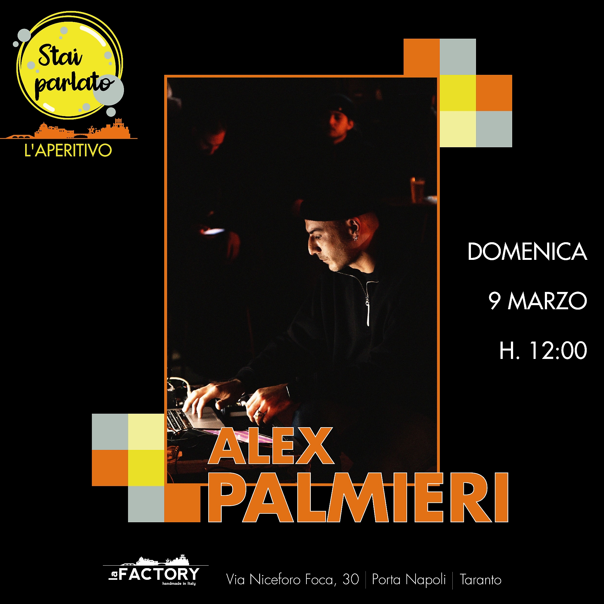 Domenica 9 marzo, a partire dalle ore 12:00, sarà la volta di Alex Palmieri, dj, producer e creatore del Salotto Elettronico di Taranto. Artista eclettico e impegnato in progetti a sfondo sociale, Palmieri è membro dell'etichetta Tape Tales e ha sonorizzato cortometraggi, spettacoli teatrali e mostre d'arte. Con il suo Salotto Elettronico, ospitato presso il Mercato Nuovo, ha dato vita a un format che unisce musica, arte e impegno sociale. In un'intervista live, Palmieri racconterà la sua esperienza e il suo mondo artistico.