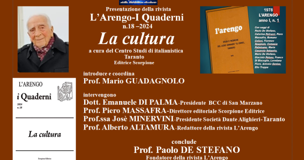Sarà presentato venerdì, 9 maggio, alle ore 17:30, negli spazi della Biblioteca Acclavio a Taranto (piazzale Bestat),l'ultimo numero de "L'Arengo", la prestigiosa rivista letteraria fondata da Paolo De Stefano.