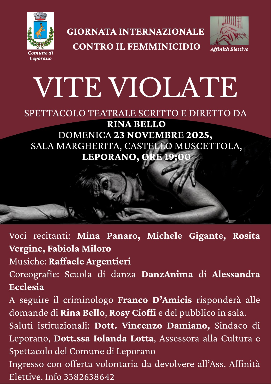 Continua a mobilitare le coscienze lo spettacolo teatrale “Vite violate”, ideato e scritto dall’autrice Rina Bello, che si ripropone come un forte monito in vista della Giornata Internazionale contro il Femminicidio che si celebra, ogni anno, il 25 novembre, istituita dall’Assemblea Generale delle Nazioni Unite il 17 dicembre 1999 attraverso la Risoluzione 54/134 per sensibilizzare l’opinione pubblica sul problema della violenza contro le donne.