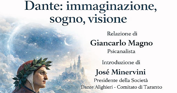 TARANTO - Esiste un legame nascosto tra il viaggio di Dante nell’Aldilà e il mondo dei sogni e dei pensieri profondi studiati oggi dagli psicologi. La Società “Dante Alighieri” di Taranto ha deciso di raccontare questo rapporto in un incontro speciale. L’obiettivo è andare oltre i soliti libri di scuola per scoprire un Dante più umano, capace di parlare ai nostri desideri e alle nostre visioni più intime. L’evento, dal titolo evocativo “Dante: immaginazione, sogno, visione”, si terrà giovedì 26 febbraio, alle ore 17.30, presso la Sala Conferenze della BCC (Banca di Bari e Taranto), in via Berardi nr. 31. Al centro della serata, la relazione di Giancarlo Magno, noto psicanalista capace di muoversi con agilità tra le strutture della mente e quelle del verso dantesco.