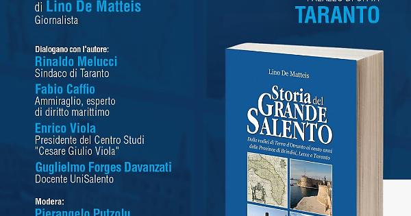 Sarà presentato lunedì, 27 maggio, alle ore 17,00, nella “Sala degli Specchi” del Palazzo di Città di Taranto, il volume del giornalista Lino De Matteis dal titolo “Storia del Grande Salento” (Edizioni Grifo).