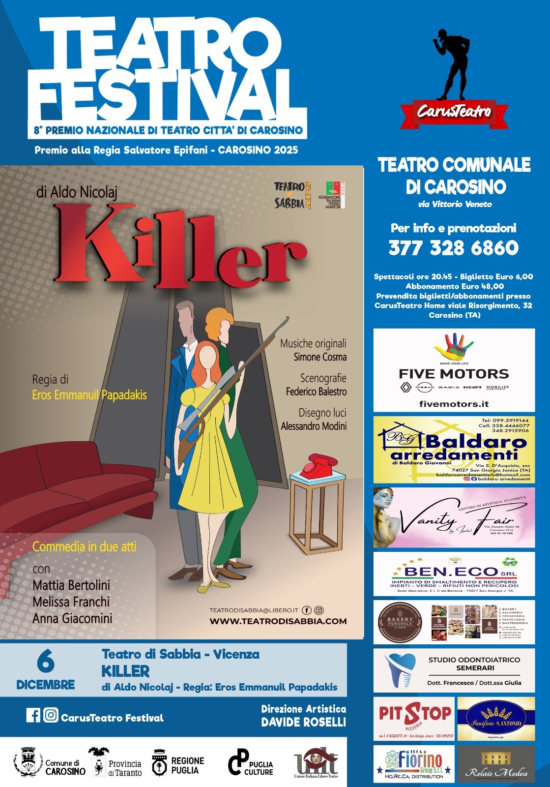 Il prossimo appuntamento vedrà la compagnia “Teatro di Sabbia” di Vicenza portare in scena “Killer” di Aldo Nicolaj con la regia di Eros Emmanuil Papadakis, un lavoro teatrale con una “verità” da scoprire insieme tra risate a crepapelle, colpi di scena e dialoghi brillanti.