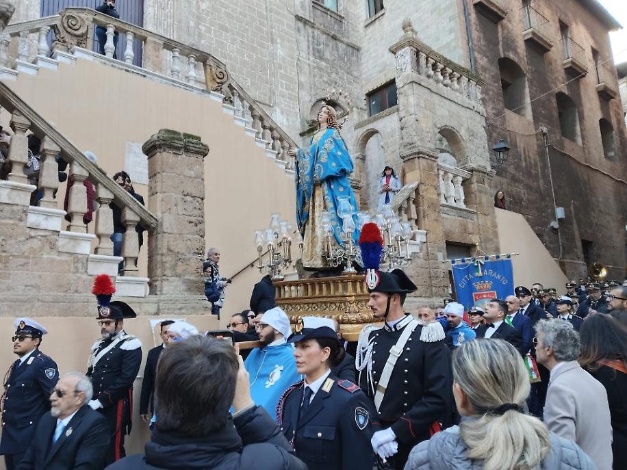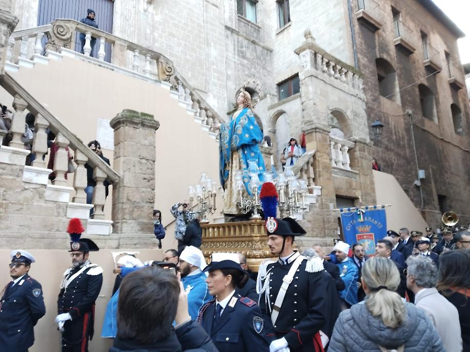 TARANTO – La processione snodatasi per i vicoli della Città vecchia stamane, 8 dicembre, ha concluso i festeggiamenti in onore della Beata Vergine Immacolata, patrona celeste di Taranto insieme a San Cataldo. Il bellissimo simulacro mariano, esposto nella basilica cattedrale, subito dopo la santa messa del parroco mons. Emanuele Ferro è stato portato a spalla dai confratelli dell’Immacolata nella tradizionale mozzetta celeste.
