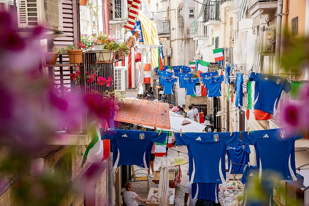 Alla vigilia della terza e ultima partita del girone di UEFA EURO 2024, che vedrà l’Italia affrontare la Croazia per ottenere il passaggio del turno agli ottavi di finale, Bari si è riempita di bandiere tricolori e maglie della Nazionale di calcio. Tantissime le casacche azzurre appese sui balconi dell’iconica strada Arco Basso, conosciuta anche come “la strada delle orecchiette”, tipicità culinaria della tradizione locale.