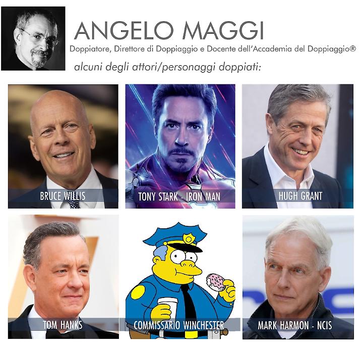 Angelo Maggi: Tra i più importanti attori da lui doppiati ci sono: Tom Hanks in Cast Away, Prova a prendermi, Cloud Atlas, The Terminal e Il ponte delle spie, Robert Downey Jr. nel ruolo di Tony Stark/Iron Man nel Marvel Cinematic Universe, Gary Oldman nei panni del commissario James Gordon ne Il cavaliere oscuro e Il cavaliere oscuro – Il ritorno di Christopher Nolan, Bruce Willis in The Sixth Sense – Il sesto senso e in Unbreakable – Il predestinato. Maggi ha prestato voce a John C. McGinley il dottor Perry Cox nella serie televisiva Scrubs – Medici ai primi ferri, e, soprattutto, a Mark Harmon  il celebre agente Leroy Jethro Gibbs in NCIS – Unità anticrimine, JAG – Avvocati in divisa, NCIS: Los Angeles e NCIS: New Orleans.Maggi ha doppiato, inoltre, Hugh Grant, Tim Robbins, Timothy Hutton, Steve Guttenberg, Danny Huston, Jackie Chan, Rupert Everett, John Turturro.E’ noto, inoltre, per avere preso parte al doppiaggio della serie cult i Simpsons in cui presta la voce al commissario Clancy Winchester e al Reverendo Lovejoy.