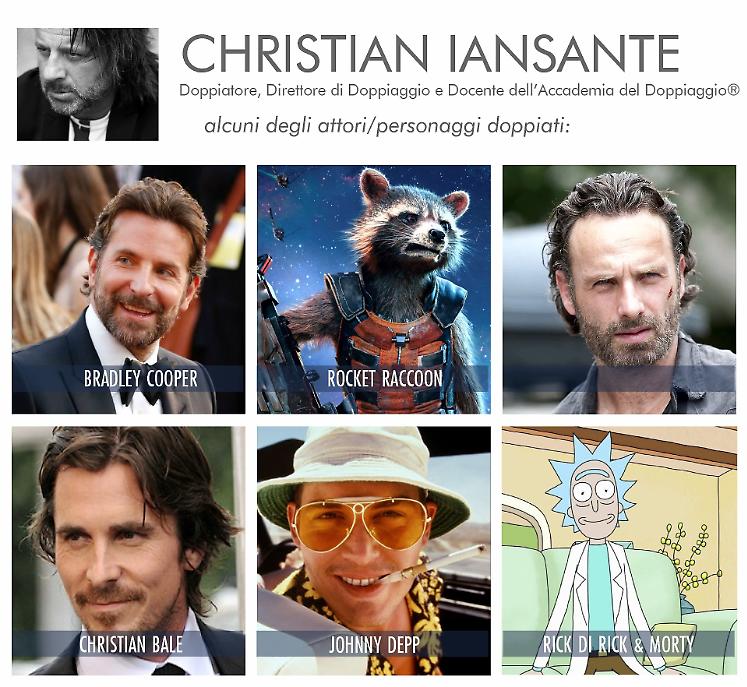 Christian Iansante ha ultimato da poco il doppiaggio di Rick nella serie animata statunitense Rick and Morty giunta alla sua settima edizione. E’ un doppiatore, attore, speaker radiofonico. Nel 1996 doppia Ewan McGregor nel film cult Trainspotting. Il monologo di Mark Renton è uno dei più famosi della storia del cinema: da qui comincia la sua fortunata carriera. L’anno successivo è Matt Damon in Will Hunting – Genio Ribelle, capolavoro che vede nel cast anche Robin Williams e Ben Affleck e vincitore di due Premi Oscar. Doppia attori del calibro di Johnny Depp, Christian Bale, Jeremy Renner, Sam Rockwell, Christian Slater e Joseph Fiennes, quest’ultimo in altro grande classico degli anni ’90 come Shakespeare in Love. Con Una Notte da Leoni presta per la prima volta la sua voce a Bradley Cooper, attore doppiato per ben 22 film. Importante anche il suo lavoro nelle serie tv, in particolare con il doppiaggio di Andrew Lincoln in The Walking Dead. In radio, è la voce ufficiale di Radio 24 ed ha preso parte agli sketch comici della trasmissione Lo Zoo di 105. È la voce recitante in due album di Caparezza (Le dimensioni del mio caos, 2008) e Adriano Celentano (Facciamo finta che sia vero, 2012).