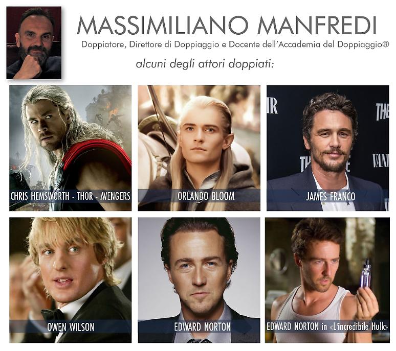 Massimiliano Manfredi: Direttore di doppiaggio molto quotato nel panorama nazionale ed internazionale, opera spesso nelle produzioni Disney e del suo gruppo. È noto soprattutto per essere il doppiatore principale di Orlando Bloom, Chris Hemsworth e James Franco, e per aver prestato la voce a Mark Wahlberg, Owen Wilson, Matt Damon e Edward Norton in alcune significative interpretazioni; a Ewan McGregor nel film Moulin Rouge!, Adrien Brody ne Il pianista e nella serie televisiva Peaky Blinders, Sean Kanan in Beautiful, Barry Watson in Settimo cielo e il giovane gareggiante Saetta McQueen in Cars - Motori ruggentiCars 2Cars 3 e la serie animata Disney+ Cars on the Road.