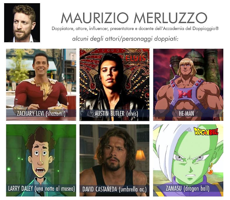 Maurizio Merluzzo è un doppiatore, attore, presentatore e influencer con un impressionante seguito di follower che lo attesta ai primi posti in tutte le classifiche social. Merluzzo doppia Zachary Levi in Shazam! The Mauritanian, Shazam! Furia degli dei, Vincent Gallo in 2 giorni a New York, Jonathan Groff in Matrix Resurrections, Idris Elba in Sonic – Il film 2, Austin Butler in Elvis sono solo alcuni degli attori a cui Merluzzo presta la voce. Non mancano doppiaggi in serie di successo. In Chicago Med doppia Dominic Rains, in Vikings è la voce di Andrew Gray, in Titans quella di Drew Van Acker. Merluzzo è molto attivo nel doppiaggio di cartoni animati. Doppia Sai in Naruto: Shippuden, Mirio in My Hero Academia, ed ancora Zamusu in Dragon Ball, Manigoldo di Cancer in I Cavalieri dello Zodiaco – The Lost Canvas, He-Man in Masters of the Universe: Revelation, Larry Daley in Una notte al museo – La vendetta di Kahmunrah.