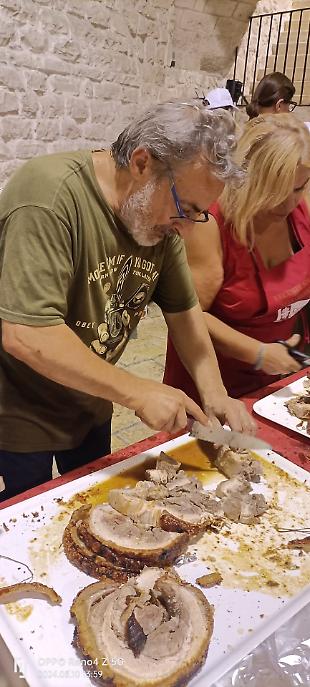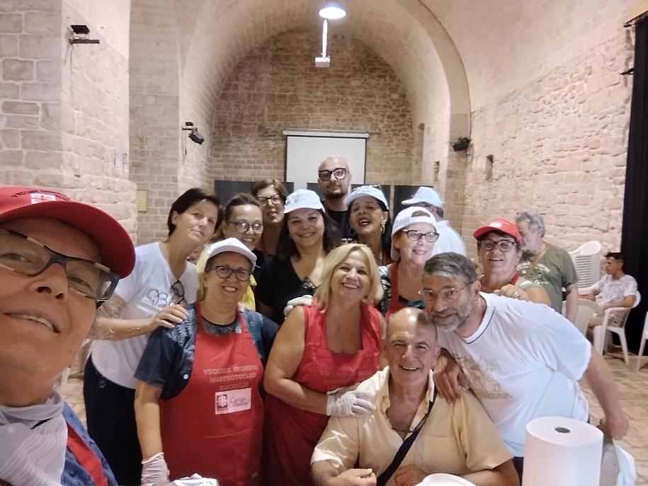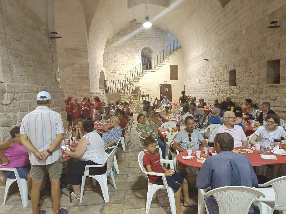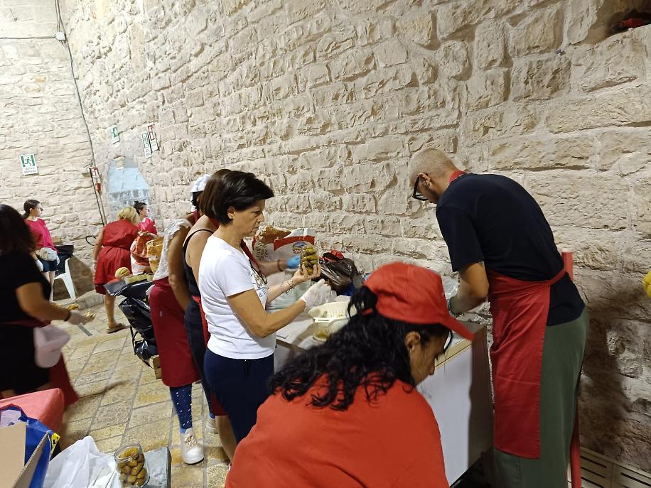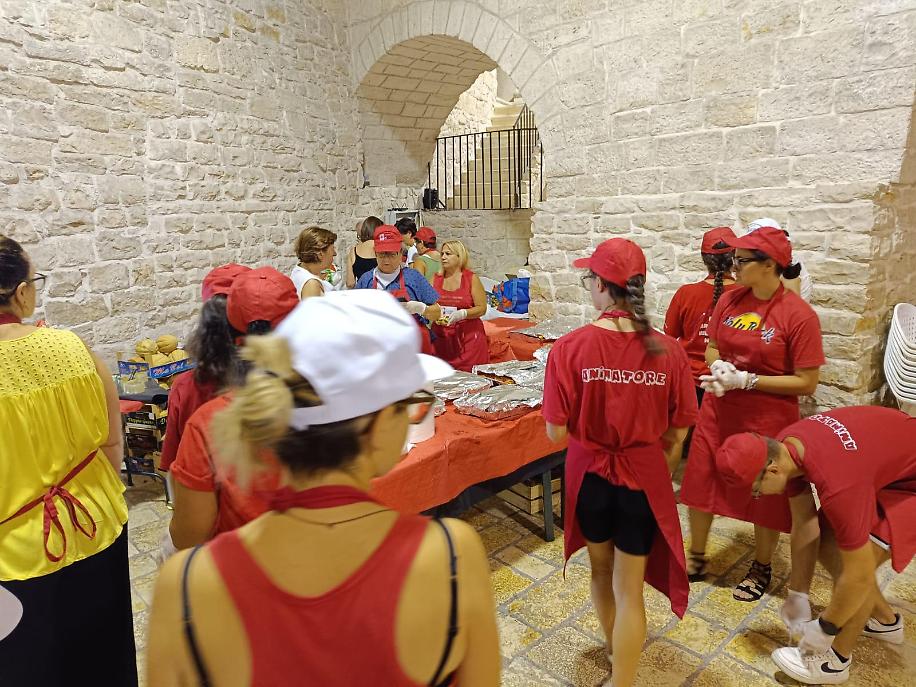 Antonio, Michele, Andreina, Licia, Giulia, Maristella, Gabriella, Franca, Carmela, Leonardo e altri volontari storici Caritas non hanno fatto mancare il loro apporto: apparecchiare e sparecchiare dopo aver pulito tutto, impiattare, pozionare antipasti, primi, secondi, dolce e frutta sembra un lavoro da poco, ma diventa faticosissimo in giornate torride come quelle di questo agosto e farlo per 150 persone. Ma tutto va fatto per iniziare la festa patronale con un momento di carità e condivisione conviviale.