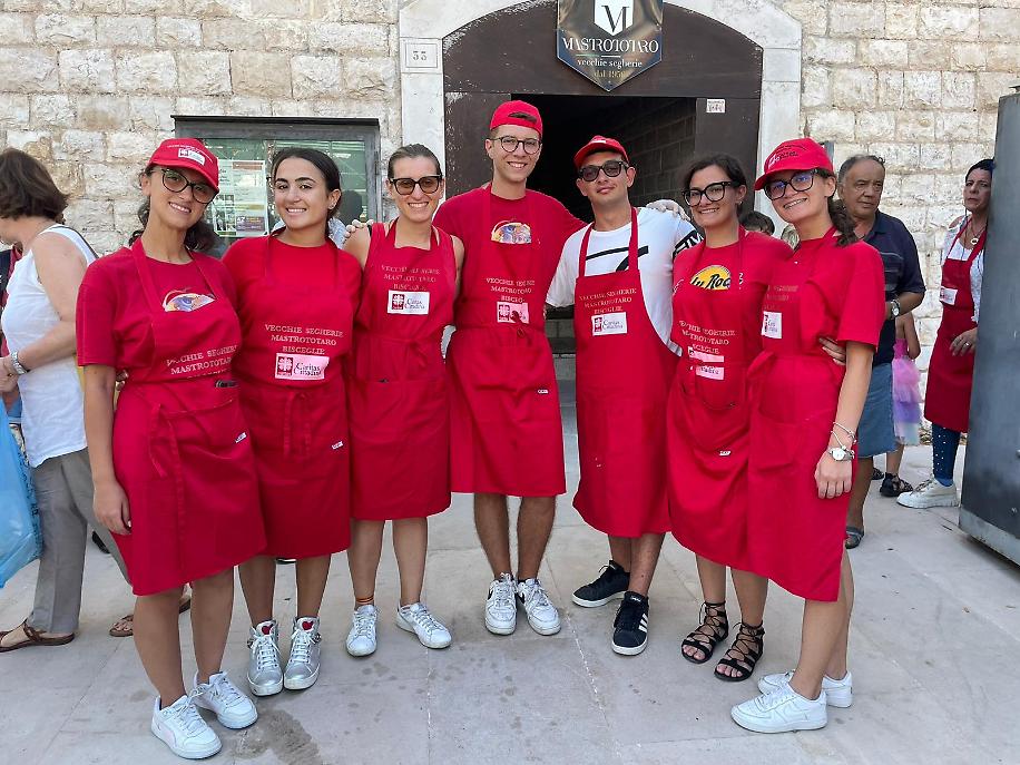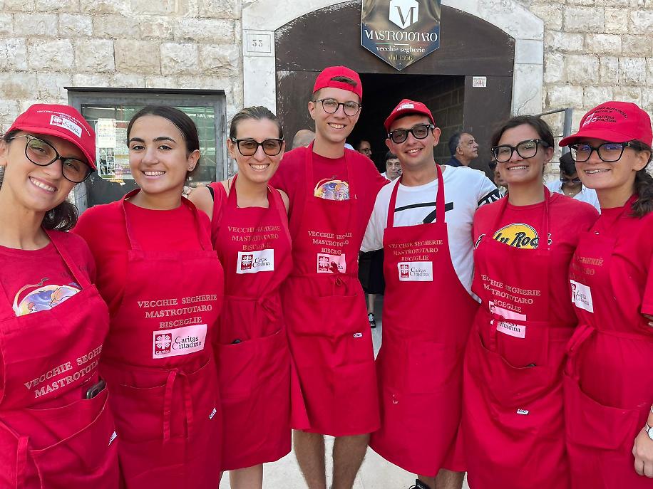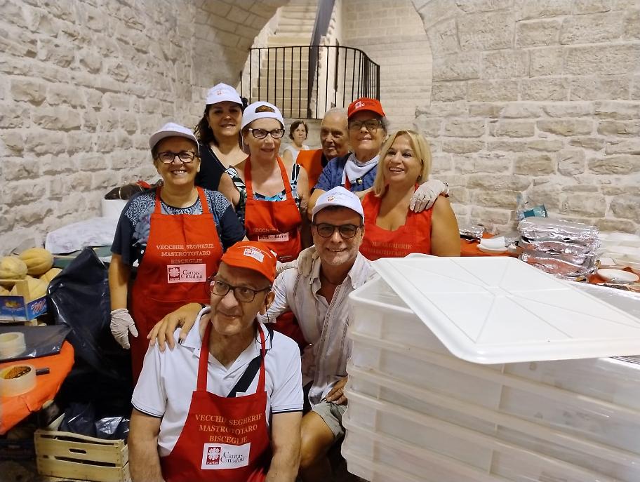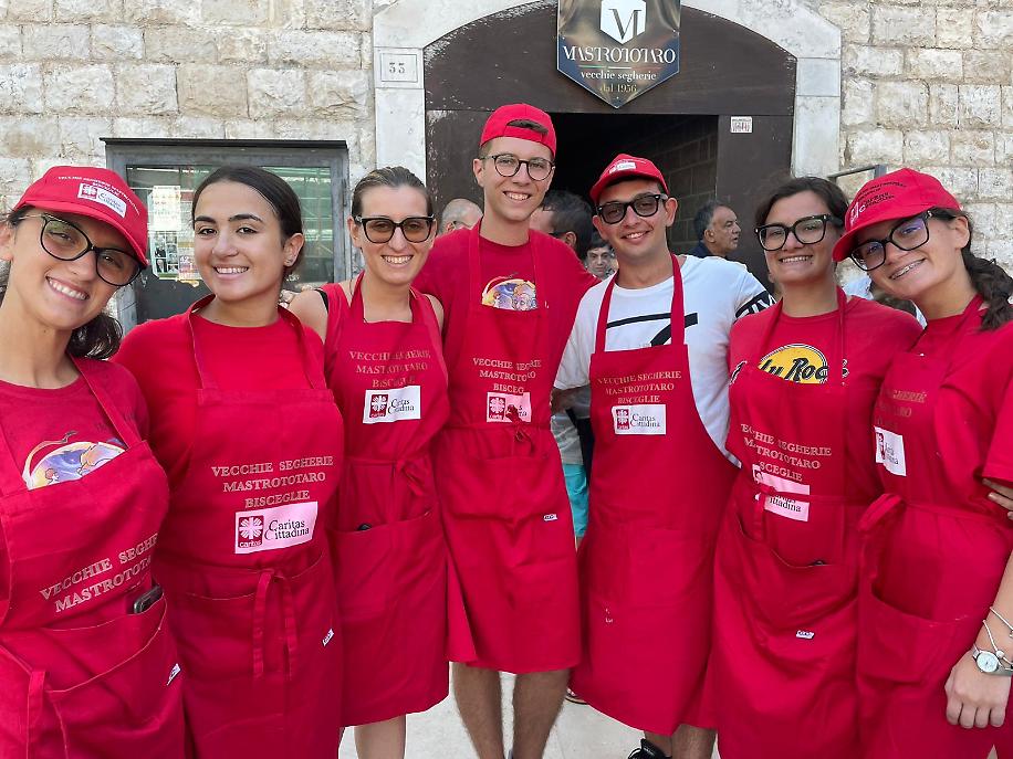 I volontari Caritas con i volontari del Comitato feste patronali hanno avuto il supporto di forze giovani anche quest’anno. Non hanno voluto far mancare la loro presenza le sette giovani della Caritas Ambrosiana, provenienti dalle parrocchie di Monza Brianza. Presenti a Bisceglie per un campo di formazione - servizio dal 30 luglio, ospitate nel “seminario” vescovile guidate da Don Matteo e coordinate da Irene Papagni, hanno prestato il loro servizio in varie strutture: Casa di accoglienza per tossicodipendenti “don Tonino Bello” di Ruvo, presso l’associazione “Senza sbarre” di Andria, la “Pegaso” di Bisceglie e, alla vigilia della partenza per la Lombardia, al pranzo dei Santi, durante il quale, oltre al servizio ai tavoli, hanno animato i giochi a nascondino dei bimbi presenti all’esterno del locale.