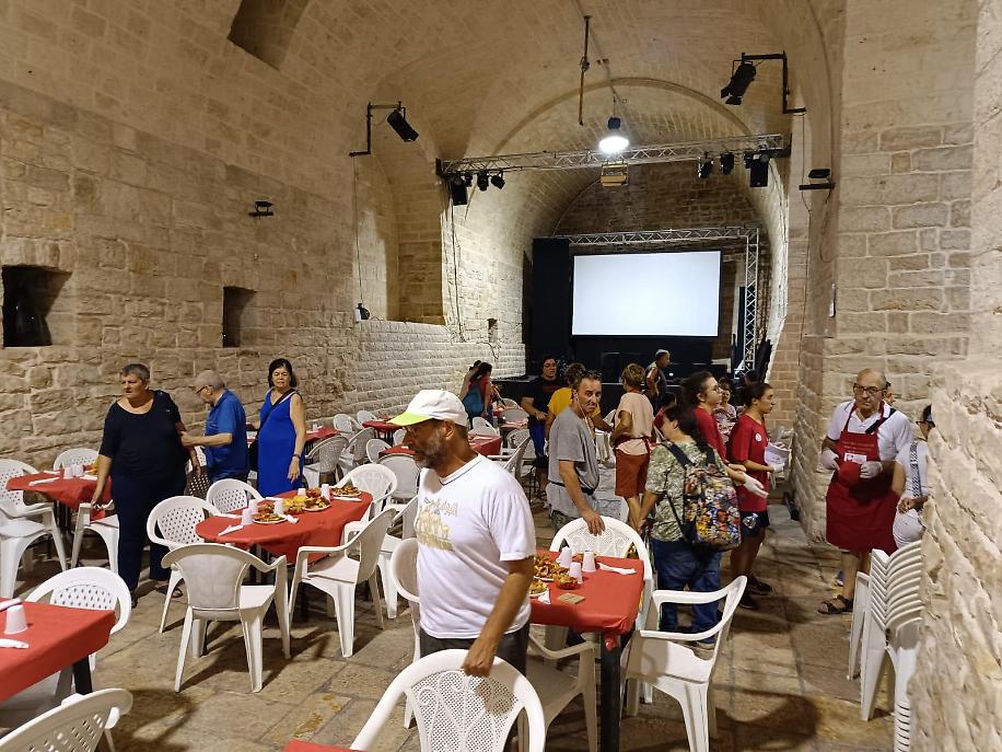 Quest’anno il Pranzo si è tenuto sabato 10 agosto: non essendo giornata festiva, non è stata celebrata alcuna messa, ma don Matteo Losapio, presente in tutta la manifestazione insieme a sette giovani di due parrocchie barlettane (San Giovanni e SS. Trinità) che avevano partecipato con lui alla Giornata Mondiale della Gioventù, ha aperto il pranzo con la “Benedizione della tavola”, preghiera di ringraziamento al Signore pe il cibo che ci viene “offerto”. Cibo ottimo ed abbondante: antipasti offerti dalla Mastrototaro food,e bibite offerte da Di Bitetto, i primi (lasagne e pasta al forno) offerte dai ristoranti Salsello, Torre Rossa, Beverly, i secondi pesce per i fratelli mussulmani, contorno di patate e una particolarmente buona porchetta offerte rispettivamente da Pane e Pomodoro, Pique Nique, e Casale San Nicola; la frutta, uva e melone, da Consorzio La Ciliegia Bisceglie e Coop. Torre Maestra. E dolcetti provenienti da varie pasticcerie biscegliesi.