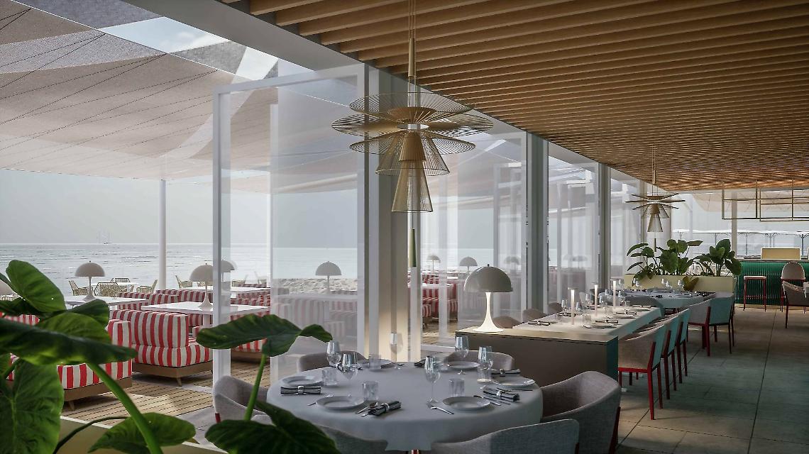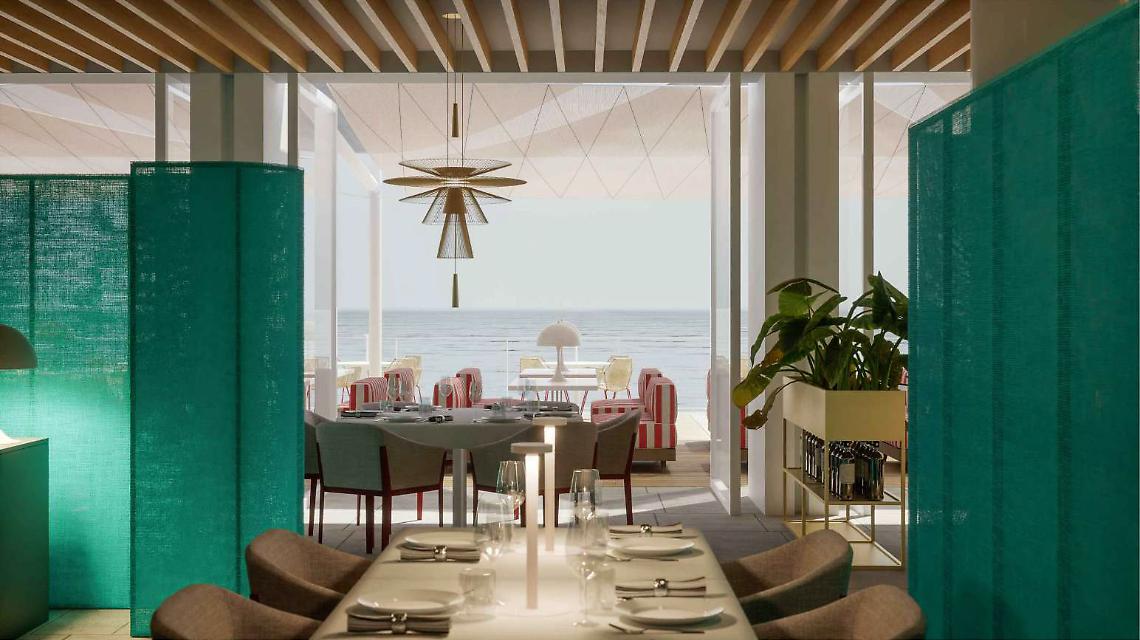 Il progetto prevede la ristrutturazione completa dell’immobile con interventi su strutture, impianti e spazi interni, migliorando l’efficienza energetica e l’impatto visivo. L’area ospiterà un ristorante upscale (90 coperti), un bistrot-pizzeria su terrazza panoramica (90 coperti), un cocktail bar interno ed esterno e un’ampia zona solarium.