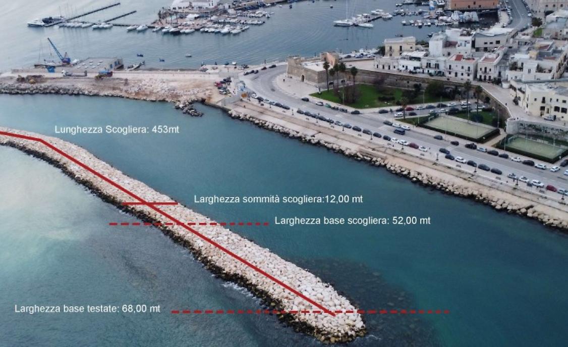 Questa fase segue il complesso intervento di messa in sicurezza del molo, avviato nell’ottobre 2023 e conclusosi a febbraio 2025, con la realizzazione di una nuova scogliera lunga 453 metri, larga 12 metri in sommità e fino a 52 metri alla base, costituita da circa 140.000 tonnellate di massi provenienti da cava. Il cantiere marittimo ha richiesto l’impiego coordinato di 4 motonavi, indispensabili per seguire l’andamento del fondale e realizzare l’opera di difesa.