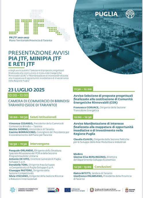 TARANTO - La sfida della transizione giusta a Taranto entra nella sua fase operativa. Questa mattina, nella sede della Camera di Commercio, alla presenza di numerosi stakeholder del territorio, sono stati illustrati i primi bandi finanziati dal Just Transition Fund (JTF), lo strumento europeo dedicato alla decarbonizzazione delle aree più colpite dalla transizione ecologica.