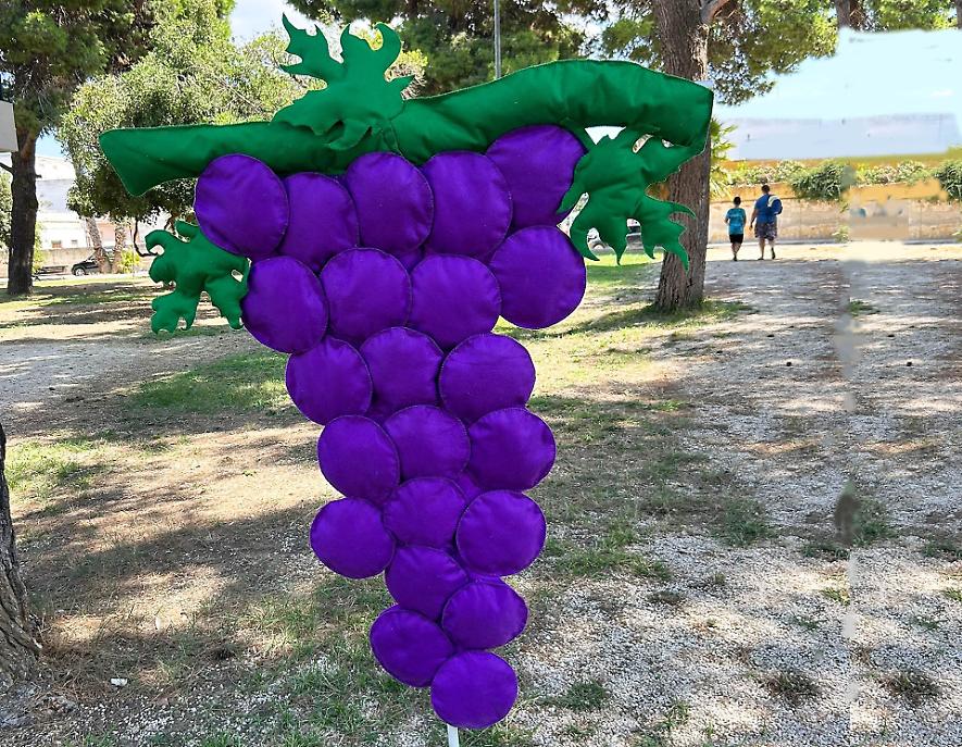 Nel laboratorio "Il Grappolo creativo" una maestra di cucito creativo ha accompagnato i bambini nella realizzazione di un grande festone in "panno lenci", un metro per un metro e cinquanta, che raffigura un rubicondo grappolo di uva scura, il colore del vino che zampillerà dalla fontana nella piazza di Carosino dove il manufatto sarà esposto durante la Sagra del Vino!