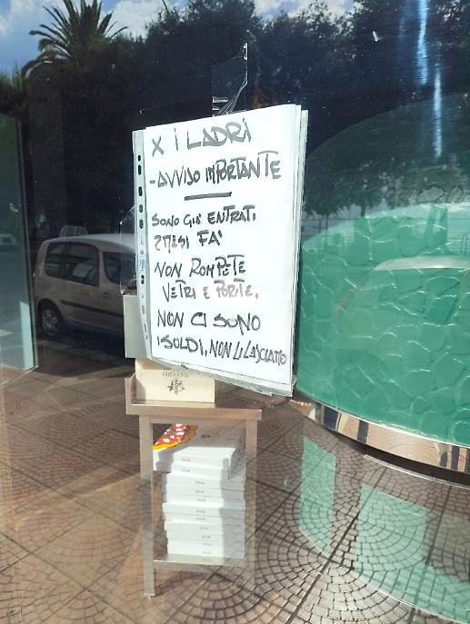 «Siete già entrati 2 mesi fa, non rompete vetri e porte, non ci sono i soldi, non li lasciamo». E, vicinissimo, sempre una scritta nera a caratteri grandi su un foglio bianco: «Non lasciamo i soldi in cassa, quindi per favore non rompete porte e vetri: è tempo perso!».
