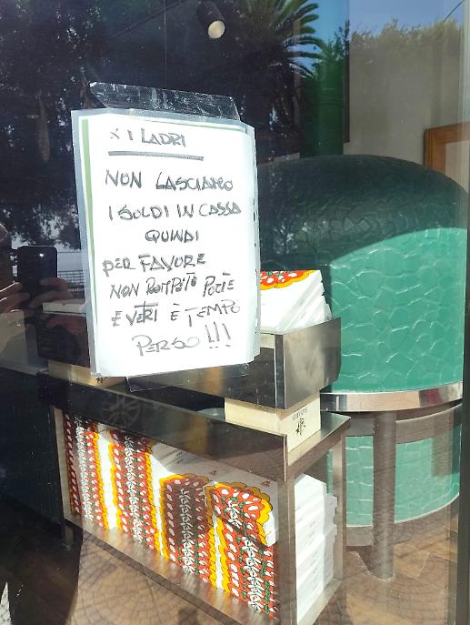L'iniziativa è di una pizzeria, il cui locale è situato sul Lungomare di Taranto. Un doppio messaggio ai ladri, la richiesta di non creare ulteriori danni perchè non troveranno quello che cercano. Un segnale anche dell'emergenza sicurezza di cui molto si è parlato in questa estate tarantina che va terminando, e che ha investito anche negozi e locali commerciali.
