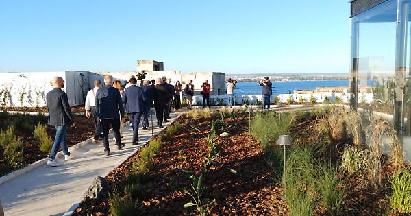 Si starebbe ore e ore su quel terrazzo ad ammirare ciò che il Padreterno ha donato alla nostra Taranto, ed è tanto. Ma è tempo di raggiungere il salone, riuniti attorno al grande tavolo, per ascoltare le parole di circostanza del ministro Abodi e del commissario straordinario ai Giochi, Massimo Ferrarese. Le loro mani stringono il collo di mastodontiche bottiglie di pregiato champagne "Moet & Chandon" (Il "mò esce Andonio" del film di Totò). Il tappo salta e si brinda alle migliori fortune dei Giochi, della città e di tutti noi, ritirando poi l'omaggio (una sacchetta con il logo dei Giochi, contenente taccuino e penna).