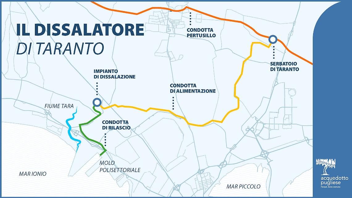 Dal punto di vista tecnico, l’impianto utilizzerà il collaudato sistema dell’osmosi inversa, sarà alimentato al 100% da energia verde e risponderà ai più severi criteri della Tassonomia ambientale europea. Due le condotte principali previste: la prima, lunga 14 chilometri di cui 5 realizzati con tecnologie no-dig, porterà fino a 650 litri al secondo di acqua potabile al serbatoio di Taranto, nodo cruciale della rete idrica da 24 mila chilometri di AQP; la seconda, lunga 4,5 chilometri, rilascerà nell’area del molo polisettoriale l’acqua residua, compatibile con l’ecosistema marino e simile a quella già presente nel fiume e nel suo sbocco naturale.