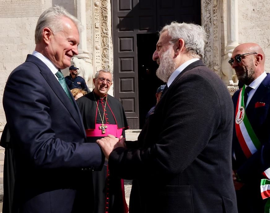 Il governatore ha anche richiamato il ruolo della Basilica di San Nicola quale simbolo universale di incontro e fraternità. Vescovo di Myra, patrono di Bari e figura venerata in tutto il mondo cristiano, San Nicola è considerato un ponte spirituale fra Oriente e Occidente. La Basilica, che da secoli accoglie pellegrini di ogni provenienza, ha svolto un’importante funzione ecumenica verso l’Oriente ortodosso, assumendo nel tempo un valore non solo religioso ma anche civile e culturale.