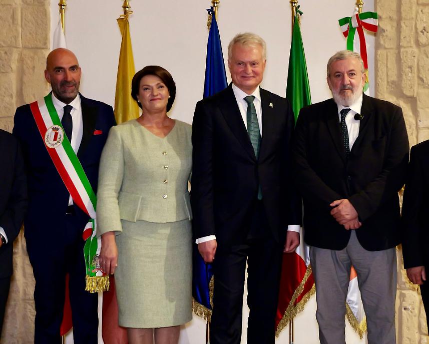 La visita è proseguita nel Castello Svevo, dove nella sala dedicata a Bona Sforza – duchessa di Bari, regina di Polonia e granduchessa di Lituania – il presidente Emiliano, affiancato dall’assessora regionale Serena Triggiani, ha rivolto un indirizzo di saluto e benvenuto alla delegazione. Nel suo discorso, il governatore ha sottolineato come la presenza del capo di Stato lituano rappresenti «un segno tangibile della forza dei legami storici, culturali e spirituali che uniscono la Lituania e l’Italia».