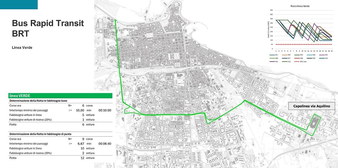 Il sistema BRT prevede quattro linee principali – Blu, Rossa, Verde e Lilla – e una quinta linea di rinforzo. Tutti i mezzi saranno completamente elettrici e viaggeranno su corsie riservate per almeno il 70% del percorso, con un sistema di priorità semaforica e telecontrollo. Ai capolinea saranno installate stazioni di ricarica e i depositi principali saranno situati in via di Vittorio, via Caldarola, largo Pacha e nel deposito Amtab.