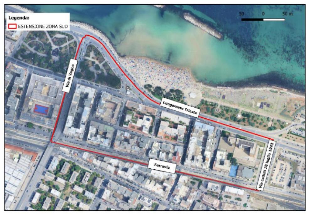 L’area interessata dall’estensione comprende la zona di Madonnella delimitata dal lungomare Trieste, via Caduti del 28 luglio 1943, la linea ferroviaria e via Di Vagno, a completamento della rete già attiva nella vicina area dell’Umbertino.