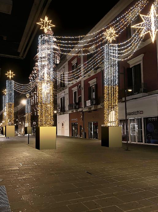 Terminato l’intervento su via Argiro, le squadre si sposteranno in via Sparano, dove è previsto un allestimento di 56 colonne luminose con drappeggi e puntali tridimensionali. L’intervento è finanziato dall’accordo quadro in corso e da due sponsorizzazioni private: una della Acmei Sud s.p.a., che installerà 9 colonne, e una della Paulicelli, che ne realizzerà altre 9.