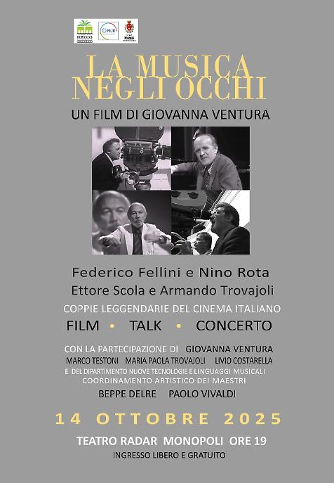 MONOPOLI – Un viaggio nel cuore della musica per il cinema, tra emozione, memoria e formazione. Da martedì 14 ottobre il Conservatorio “Nino Rota” di Monopoli inaugura un trittico di eventi che unisce suoni e immagini, arte e racconto, in un omaggio ai grandi maestri della colonna sonora italiana. Il progetto, patrocinato dal Comune di Monopoli e dall’Assessorato alla Cultura, celebra il legame tra Federico Fellini e Nino Rota, Ettore Scola e Armando Trovajoli, coppie che hanno scritto pagine indimenticabili della storia del cinema.
