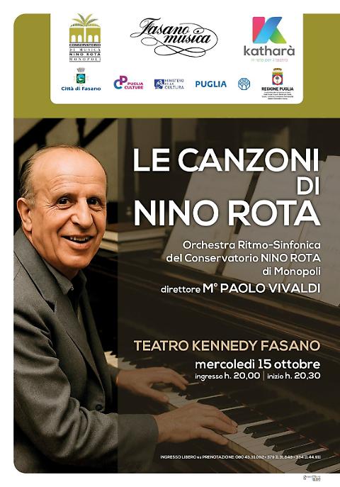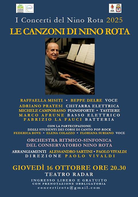Il viaggio musicale continuerà mercoledì 15 ottobre al Teatro Kennedy di Fasano, in collaborazione con Fasanomusica ETS e con il patrocinio della Regione Puglia. L’Orchestra, diretta ancora da Paolo Vivaldi, proporrà “Le Canzoni di Nino Rota”, un concerto che esplora il lato più melodico e popolare del compositore, con brani come Canzone arrabbiata, Brucia la terra, La pappa col pomodoro e Bevete più latte. Le voci saranno quelle di Raffaella Misiti e Giuseppe Delre, accompagnati da una sezione ritmica composta da Adriano Pratesi, Marco Afrune, Fabrizio La Fauci e Michele Campobasso, con la partecipazione delle vocalist Elena Colazzo, Floriana Suriano e Federica Bove.