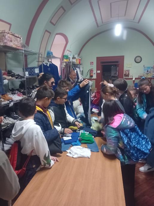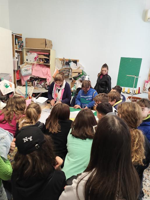 A incuriosire maggiormente i ragazzi è stata la sartoria “Storie&Stoffe”, dove Angela e Antonella hanno mostrato capi e accessori realizzati con tessuti riciclati. Alcuni alunni hanno raccontato come le proprie nonne ancora oggi si dedichino al cucito e al ricamo, trasmettendo antichi saperi di recupero. Le volontarie hanno invitato gli studenti a coinvolgere genitori e nonni, ricordando che anche poche ore di aiuto in sartoria possono fare la differenza.
