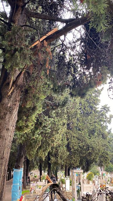 Situazione analoga anche nel cimitero monumentale, dove le forti raffiche di vento hanno spezzato i rami di un grande cipresso. Una squadra della Bari Multiservizi è intervenuta per rimuovere i rami caduti e per sistemare gli alberi che presentano parti danneggiate o a rischio di cedimento.