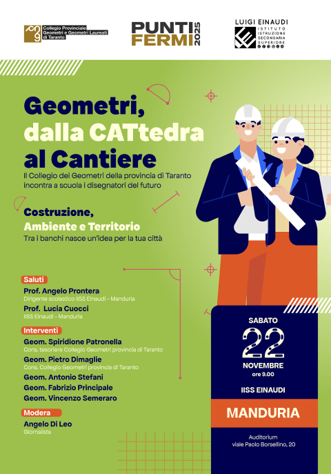L'iniziativa rientra nell'ambito dell'edizione 2025 di "Punti Fermi – Geometra il Futuro a misura" che vivrà il suo momento conclusivo il prossimo 12 dicembre nel teatro Fusco, quando nel corso della sessione mattutina (nel pomeriggio spazio a talk tematici, programma in via di definizione...) le quattro scuole protagoniste di questo percorso didattico-professionale e i rappresentanti del nostro Collegio, alla presenza di autorità, amministratori pubblici e iscritti, incroceranno tra palco e platea temi e riflessioni scaturiti dagli incontri precedenti.