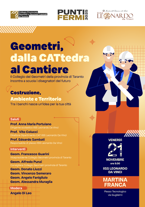 Parte venerdì 21 novembre prossimo (domani) la serie di incontri con le scuole promossa dal Collegio dei Geometri e dei Geometri Laureati della Provincia di Taranto.
