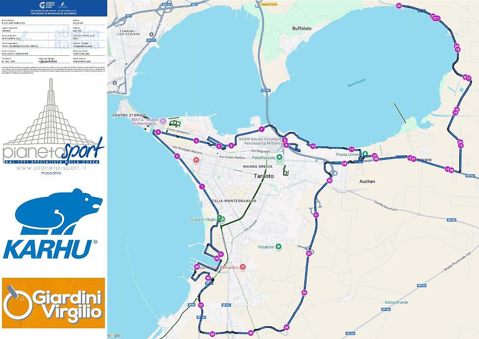 Il tracciato prevede la partenza alle 9 dai Giardini Virgilio, il passaggio su Corso Due Mari, via D’Aquino e via Di Palma, l’ingresso dall’Arsenale da Porta Principale e l’uscita da Porta Ponente. Da via del Pizzone si entrerà nella SVAM, poi il tracciato costeggerà il secondo seno del Mar Piccolo fino al Parco Cimino, per immettersi sulla SS7ter in direzione San Giorgio. Il giro di boa al km 20 sarà nei pressi dell’Histò. La corsa tornerà quindi verso Taranto tramite la Tangenziale Sud, la via per Lama e viale Jonio. Negli ultimi 5 km gli atleti percorreranno l’area della Stazione Navale Mar Grande, prima dell’ingresso finale su viale Virgilio.