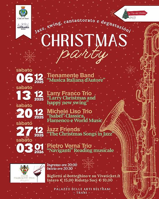 Accanto al teatro, la rassegna propone una sezione musicale che anima ogni sabato sera con concerti dal vivo accompagnati da degustazioni di vini pugliesi dell’Azienda Conte Spagnoletti Zeuli. Un percorso che, dal jazz alla world music, scandisce le serate del mese. Si parte il 6 dicembre con la Tienamente Band, seguita il 13 dicembre dal “Larry Christmas and Happy New Swing” del Larry Franco Trio. Il 20 dicembre spazio a “Isabèl” del Michele Liso Trio, mentre il 27 dicembre il Mino Lacirignola Trio propone “The Christmas Songs in jazz”. La rassegna si chiude il 3 gennaio con “Naviganti”, reading musicale del Pietro Verna Trio. I biglietti, acquistabili su Vivaticket o al botteghino, sono disponibili al costo di 15 euro, ridotto 10 euro.