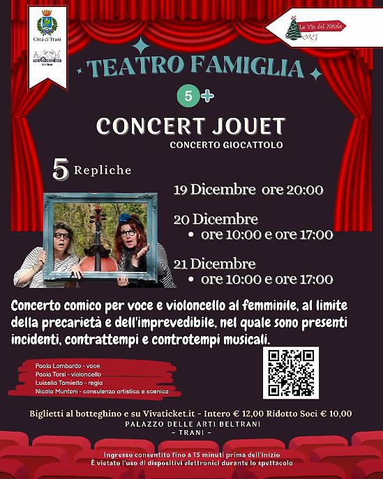 Dal 19 al 21 dicembre torna il teatro famiglia con “Concert Jouet”, spettacolo comico-musicale interpretato da Paola Lombardo e Paola Torsi, dirette da Luisella Tamietto. Un lavoro che unisce voce, corpo e musica in un equilibrio volutamente precario, premiato dal pubblico e replicato oltre 40 volte in tutta Italia.