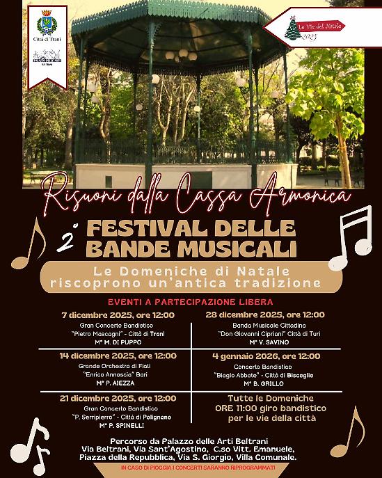 A completare il programma c’è la seconda edizione del Festival delle bande musicali, realizzato con la collaborazione di Nicola Fiore. Ogni domenica mattina i complessi bandistici partono dal Palazzo Beltrani alle 11 per raggiungere la Villa comunale, dove la Cassa Armonica dedicata ad Astor Piazzolla ospita i concerti delle 12. Il 7 dicembre apre il cartellone il Gran Concerto Bandistico “Pietro Mascagni” di Trani, seguito il 14 dicembre dall’Orchestra di Fiati “Enrico Annoscia” di Bari. Il 21 dicembre è la volta del complesso “P. Serripierro” di Polignano, quindi il 28 dicembre si esibisce la Banda Musicale “Don Giovanni Cipriani” di Turi. Chiusura il 4 gennaio con lo storico Gran Concerto Bandistico “Biagio Abbate” di Bisceglie.