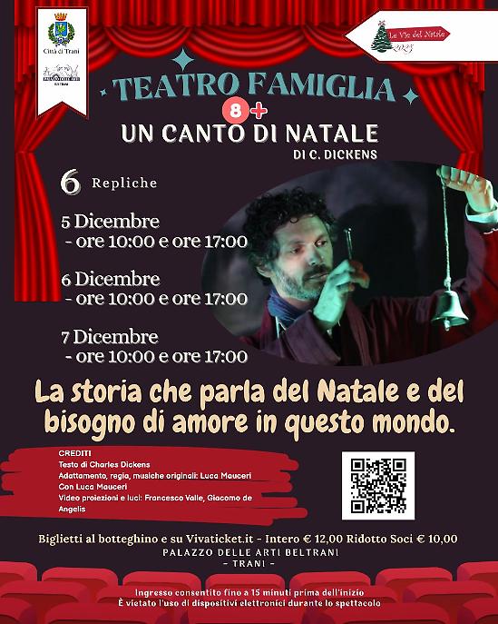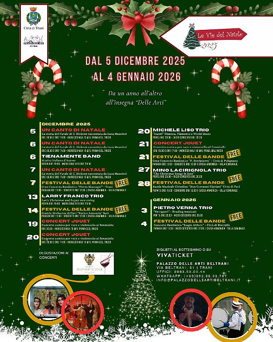 TRANI - Con l’avvicinarsi delle festività, la città si prepara a vivere “Le Vie del Natale 2025”, progetto curato da Delle Arti Odv Ets e ospitato dal Palazzo delle Arti Beltrani, che dal 5 dicembre 2025 al 4 gennaio 2026 diventerà centro di un articolato calendario di appuntamenti tra teatro, musica e tradizione. L’iniziativa si propone come un percorso culturale immersivo, capace di coinvolgere il pubblico di ogni età e di trasformare il periodo natalizio in un vero viaggio emozionale.