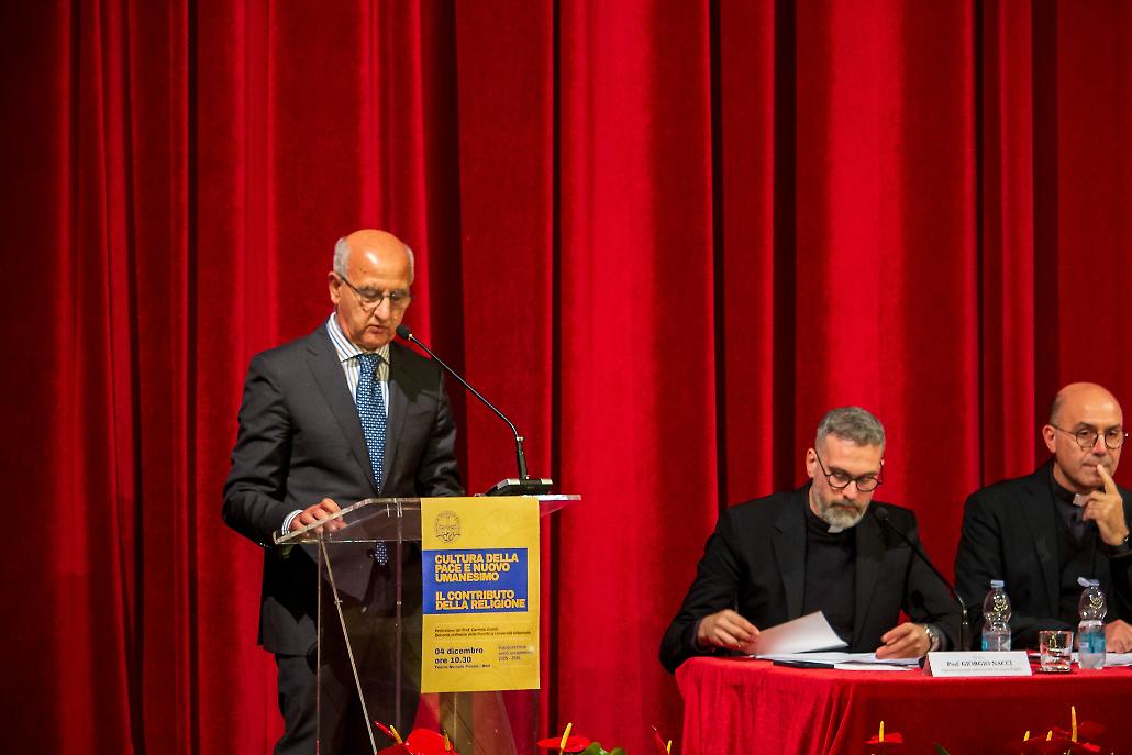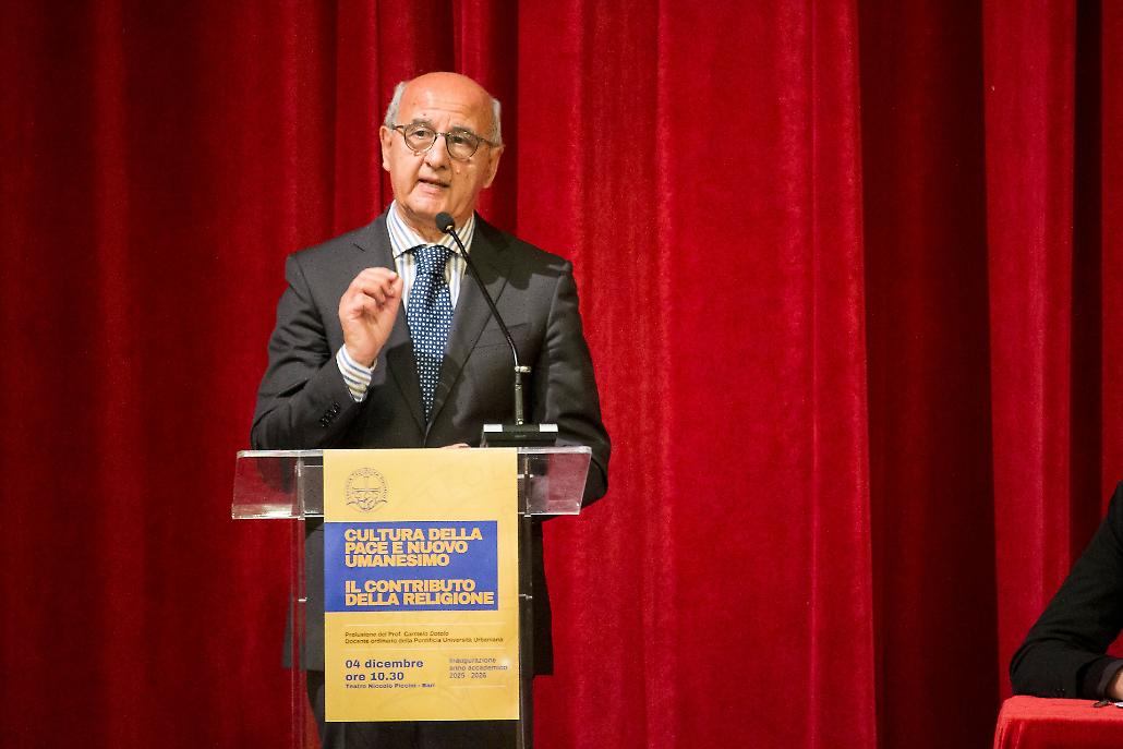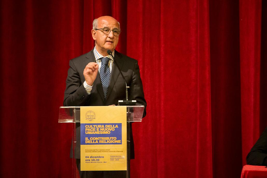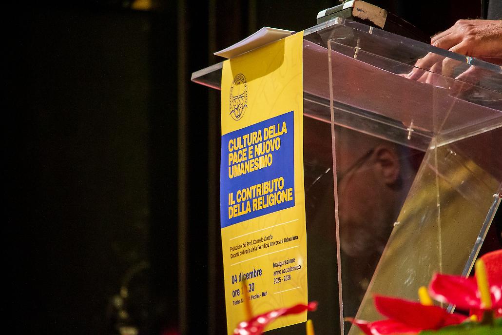 La mattinata si è aperta con il saluto del Gran Cancelliere, l’Arcivescovo di Bari-Bitonto mons. Giuseppe Satriano, seguito dagli interventi degli studenti, del sindaco di Bari Vito Leccese, e dalla relazione del preside prof. Vito Mignozzi. A concludere, la prolusione del teologo prof. Carmelo Dotolo, docente alla Pontificia Università Urbaniana di Roma, che ha guidato il pubblico in una riflessione intensa sul tema “Cultura della pace e nuovo umanesimo. Il contributo della religione”.
