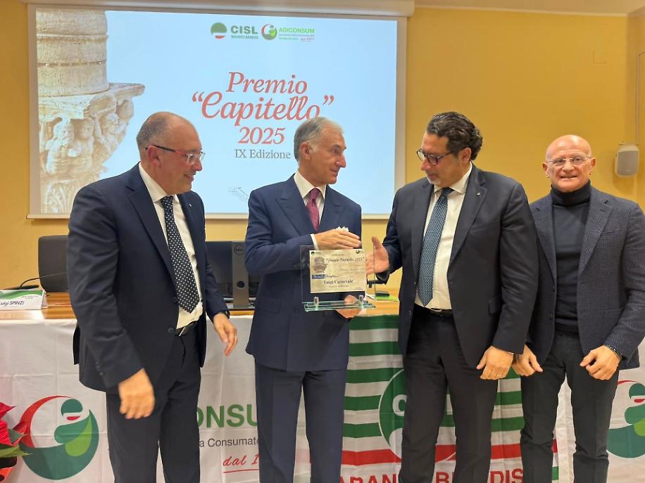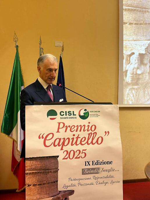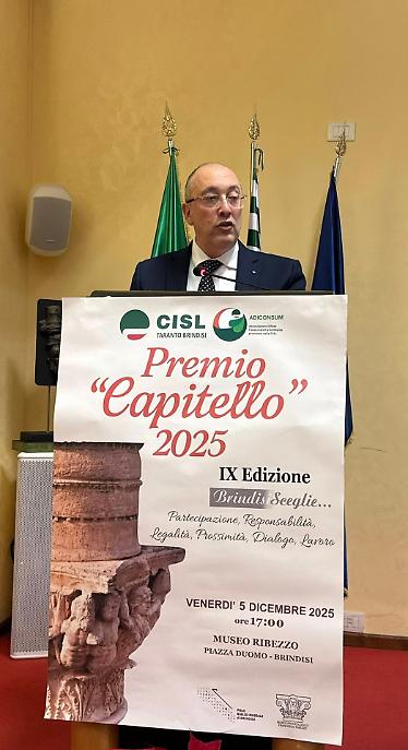 BRINDISI - È stato consegnato ieri al prefetto Luigi Carnevale il Premio Capitello 2025, giunto alla sua nona edizione e promosso da Cisl Taranto Brindisi e Adiconsum territoriale. La cerimonia, ospitata negli spazi del Museo “Francesco Ribezzo” in piazza Duomo, ha visto una partecipazione ampia, arricchita dalla presenza di numerosi rappresentanti istituzionali e militari.