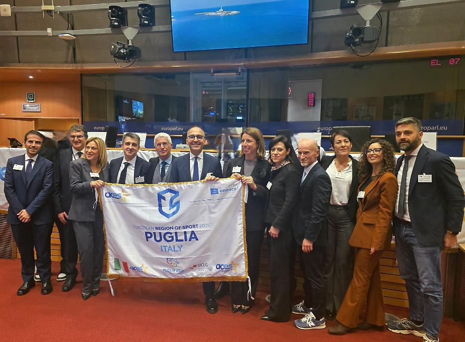 TARANTO - La Puglia ottiene il riconoscimento di Regione Europea dello Sport 2026, una designazione che assume un valore ancora più significativo perché coincide con l’anno dei Giochi del Mediterraneo di Taranto, evento che porterà la città e l’intero territorio regionale al centro della scena sportiva internazionale. L’ufficialità è arrivata nell’Emiciclo del Parlamento europeo a Bruxelles, dove il vicepresidente e assessore regionale allo Sport per Tutti Raffaele Piemontese ha firmato il documento ACES alla presenza dei rappresentanti delle istituzioni comunitarie e di una delegazione pugliese.