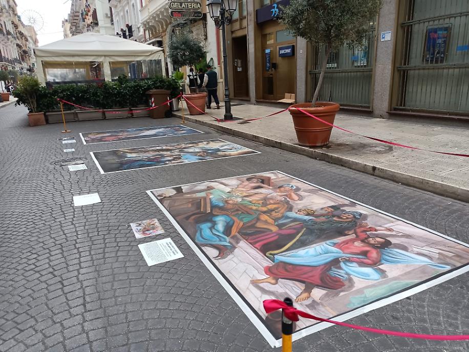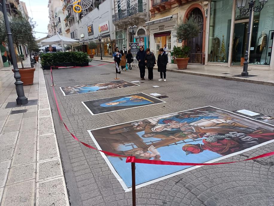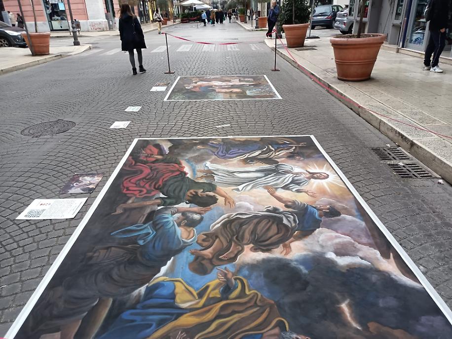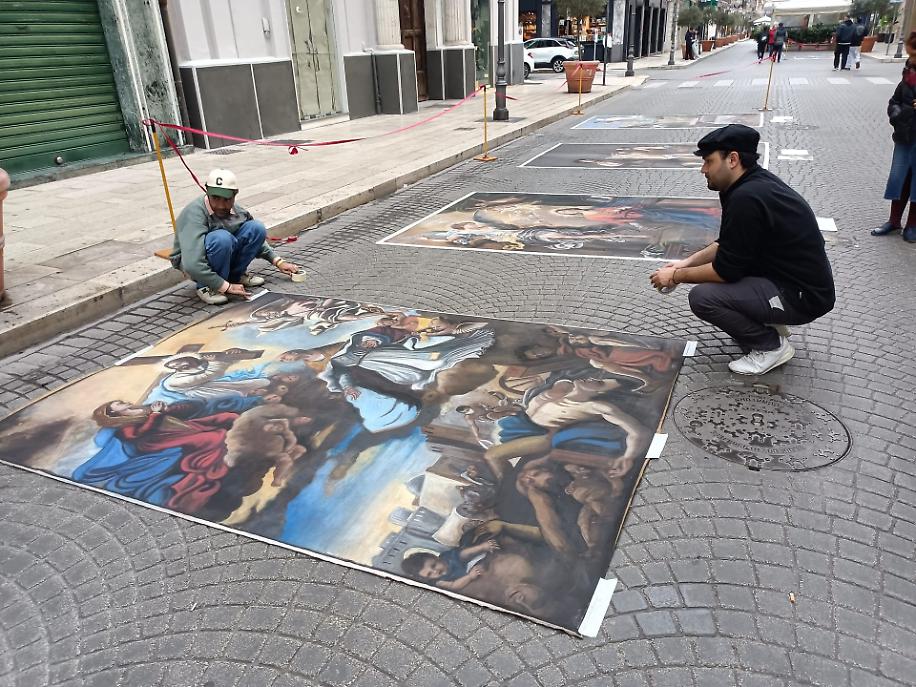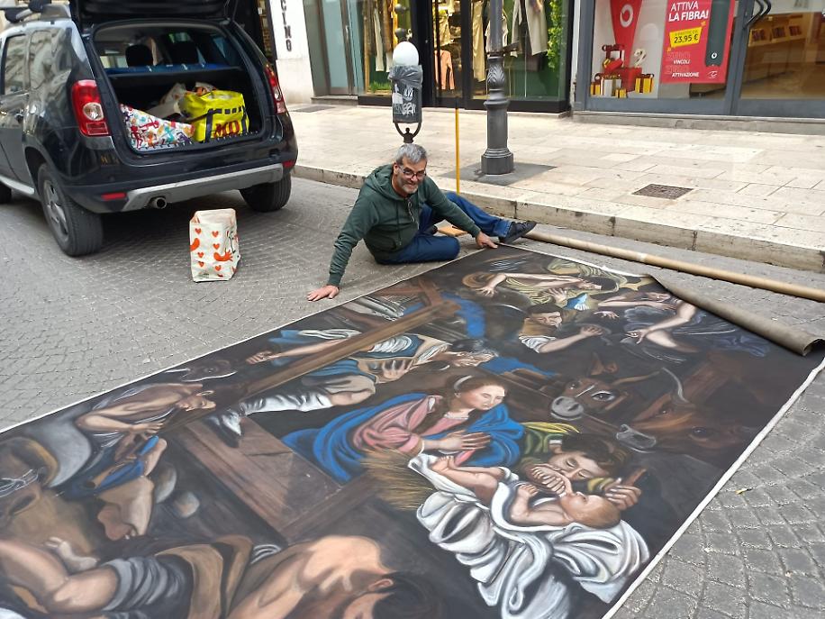 Tra le opere che hanno catturato lo sguardo e il cuore dei passanti, quelle dell’artista Gennaro Troia, esponente della scuola napoletana dei madonnari, hanno imposto il silenzio della meraviglia. Figure sacre, volti intensi, colori vivi tracciati direttamente sul suolo hanno preso forma sotto gli occhi della gente, componendo una collezione temporanea destinata a vivere nel ricordo più che nel tempo.