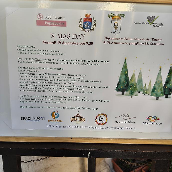Oggi, venerdì 19 dicembre, presso il Dipartimento di Salute Mentale ASL Taranto, all'ex Ospedale Vecchio in via SS. Annunziata a Taranto, spazio all'Open Day natalizio, a conclusione – per questo anno – di una serie di momenti e appuntamenti di incontro e condivisione finalizzati a creare relazioni e comunità, in linea col percorso già avviato dallo stesso DSM tarantino con la Rete per la Salute Mentale.