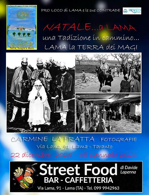 Oggi quella stessa eredità rivive nella fotografia. Il fotografo Carmine La Fratta (che si ringrazia per le splendide foto allegate) ha scelto di raccontarla attraverso la mostra “Lama, la Terra dei Magi”, aperta dal 22 dicembre e visitabile fino all’8 gennaio negli spazi di via Lama 91. In esposizione, riproduzioni di immagini antiche e scatti più recenti dialogano tra loro, componendo un racconto visivo che attraversa il tempo e restituisce l’anima di una manifestazione ormai secolare.