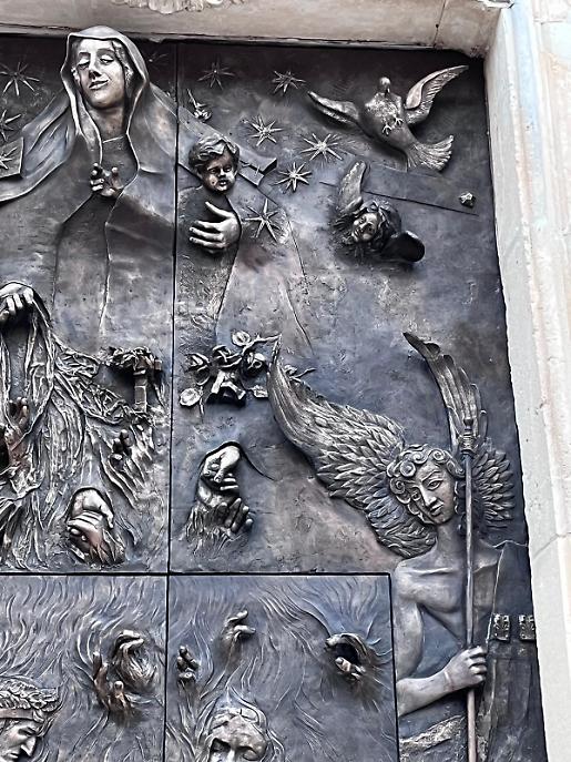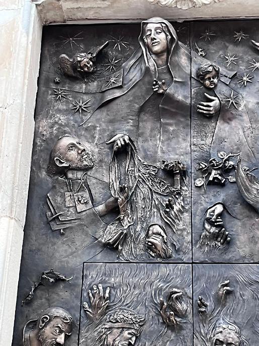 Sulle due ante del portale sono scolpite mani che si innalzano dal Purgatorio, implorando la luce del Paradiso e l’intercessione della Madonna, in un’immagine intensa che richiama la misericordia di Dio e invita alla preghiera di suffragio, ricordando che nessuno è mai perduto se si affida a Lui.