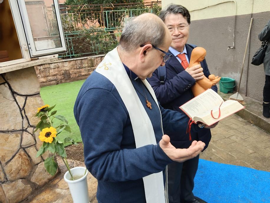 Primo appuntamento è stato quello vissuto negli spazi della chiesa di Gesù Divin Lavoratore, quasi sotto la più alta ciminiera dello stabilimento siderurgico. A fare gli onori di casa è stato il parroco padre Gianni Passacantilli, dei Giuseppini dei Murialdo, da sempre impegnato nella promozione umana e sociale di questa porzione del quartiere. “Grazie per aver donato ai bambini dei Tamburi questo parco giochi, da noi denominato ‘Giardino dei girasoli’ – ha detto - I nostri piccoli potranno così crescere come questi particolari fiori orientati verso il sole, che porta sempre amore, gioia e pace. E la pace di Gesù deve regnare sempre nel cuore dei nostri bambini”.