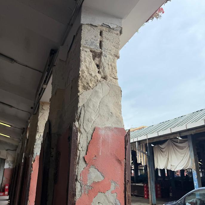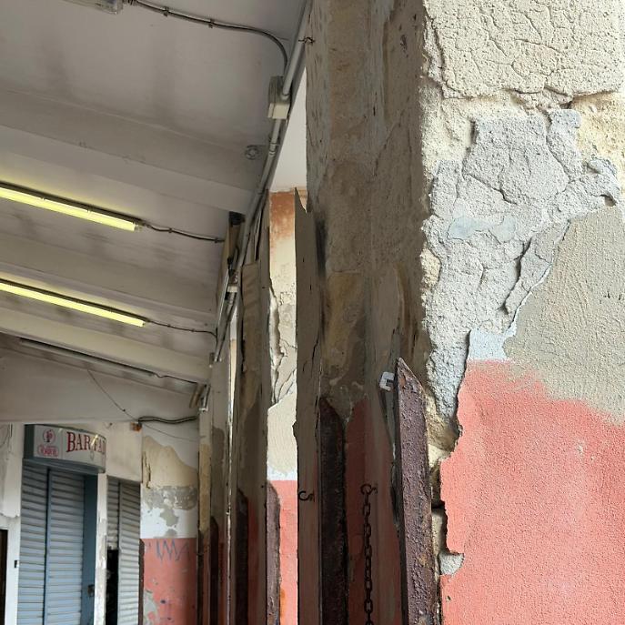 Secondo quanto segnalato dall’associazione dei consumatori, la struttura presenta infiltrazioni evidenti, intonaci deteriorati e distacchi di materiale da pilastri e murature, con ferri ossidati scoperti e parti lesionate che potrebbero costituire un pericolo per commercianti e utenti. A ciò si aggiungono accumuli di rifiuti e vegetazione spontanea sul tetto, elementi che, secondo Adoc, testimoniano una prolungata assenza di manutenzione. Le facciate interne ed esterne mostrano ampie porzioni di intonaco già caduto o in fase di distacco.