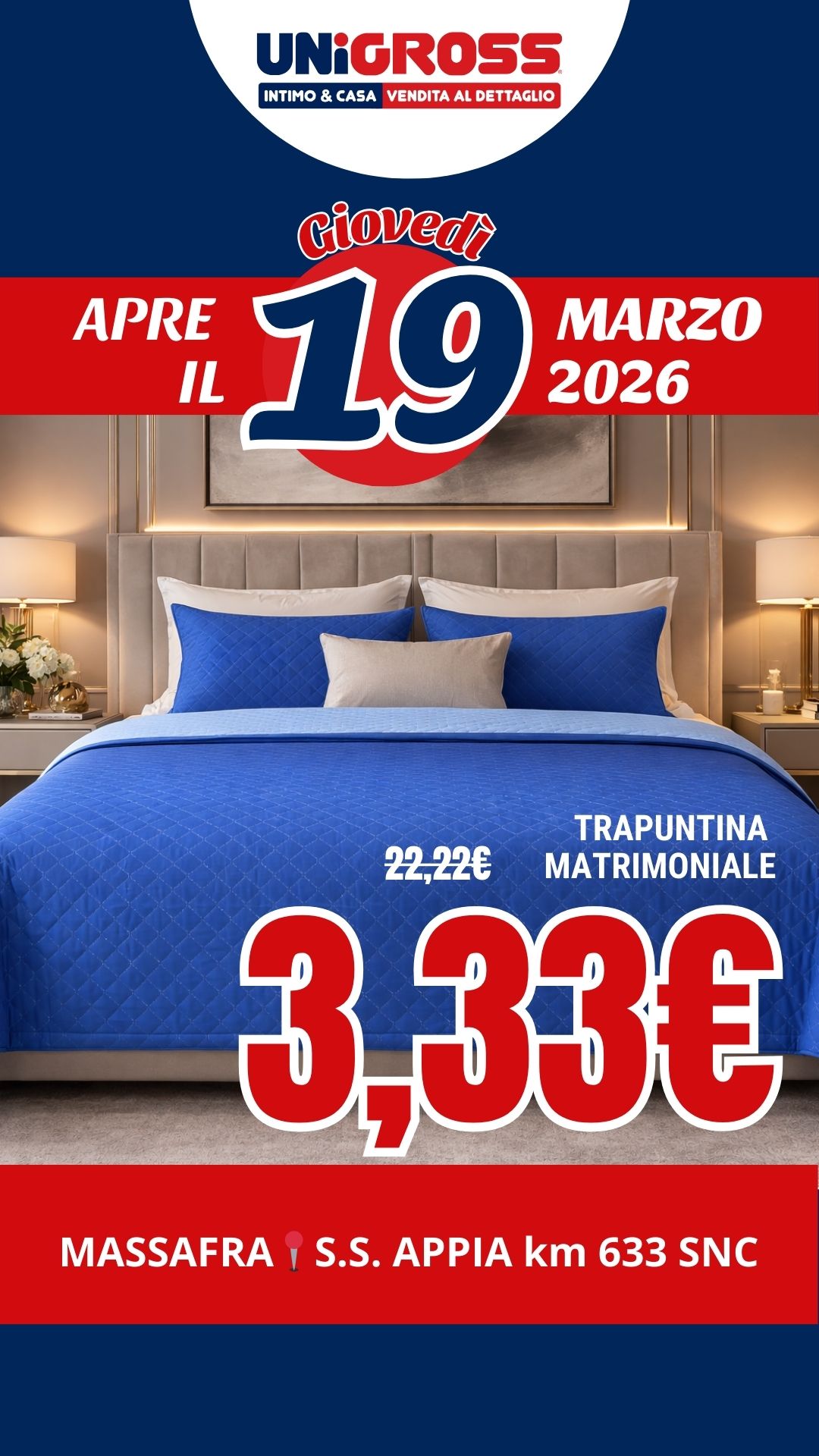 Per festeggiare l’apertura, Unigross lancia una promo speciale dedicata ai clienti che visiteranno il negozio: la trapuntina matrimoniale sarà disponibile al prezzo eccezionale di 3,33€. Per accedere all’offerta sarà sufficiente recarsi in store e iscriversi al canale WhatsApp Unigross, entrando così a far parte di una community che riceve ogni settimana promozioni e offerte esclusive.